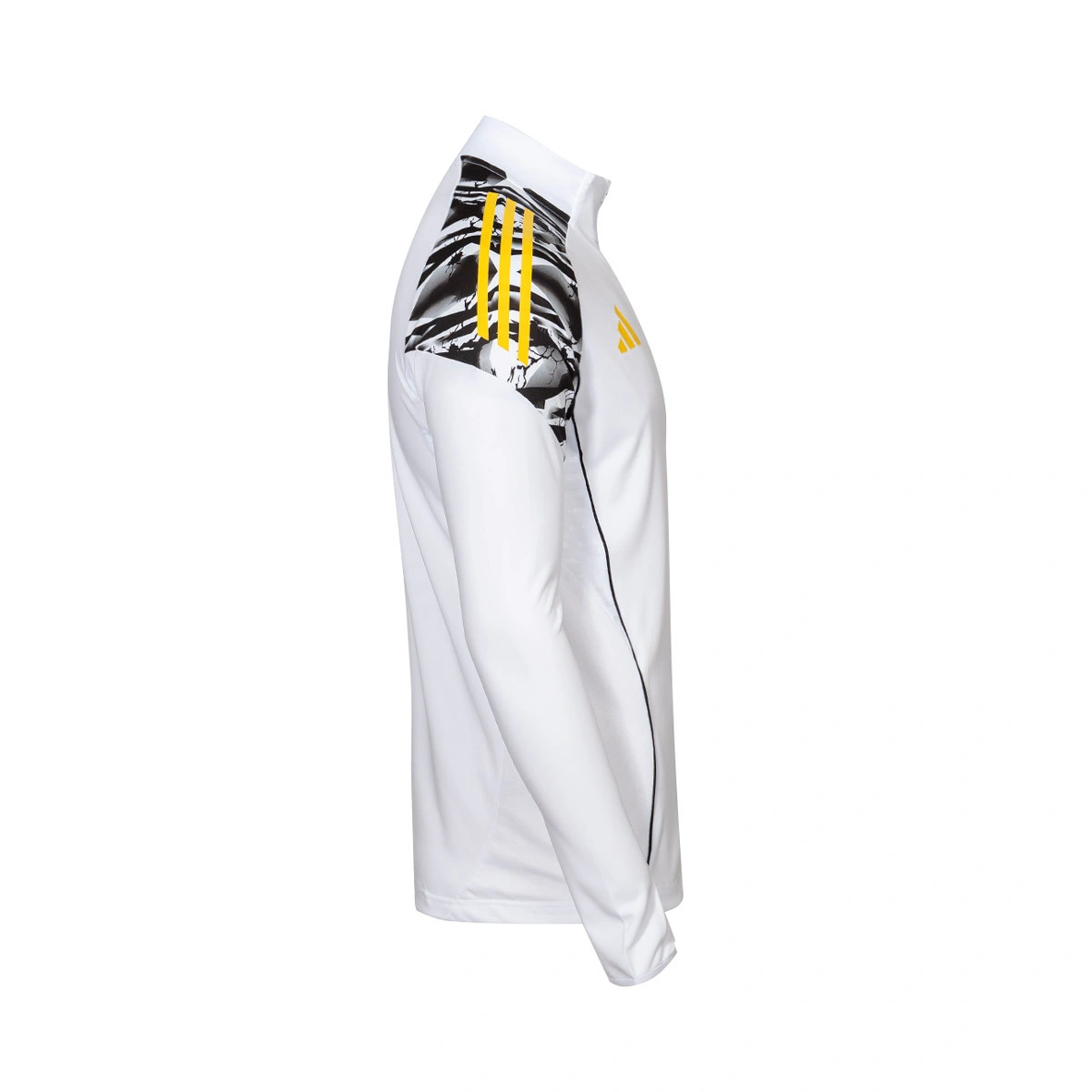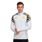 Grazie alla sua struttura traspirante, la pelle rimane asciutta e ti permette di concentrarti sul gioco senza distrazioni. La copertura protettiva con cerniera aumenta il comfort e previene le irritazioni. Il design elegante è completato dall'iconico logo adidas e dallo stemma del Real Madrid per farti distinguere con stile in qualsiasi stadio.