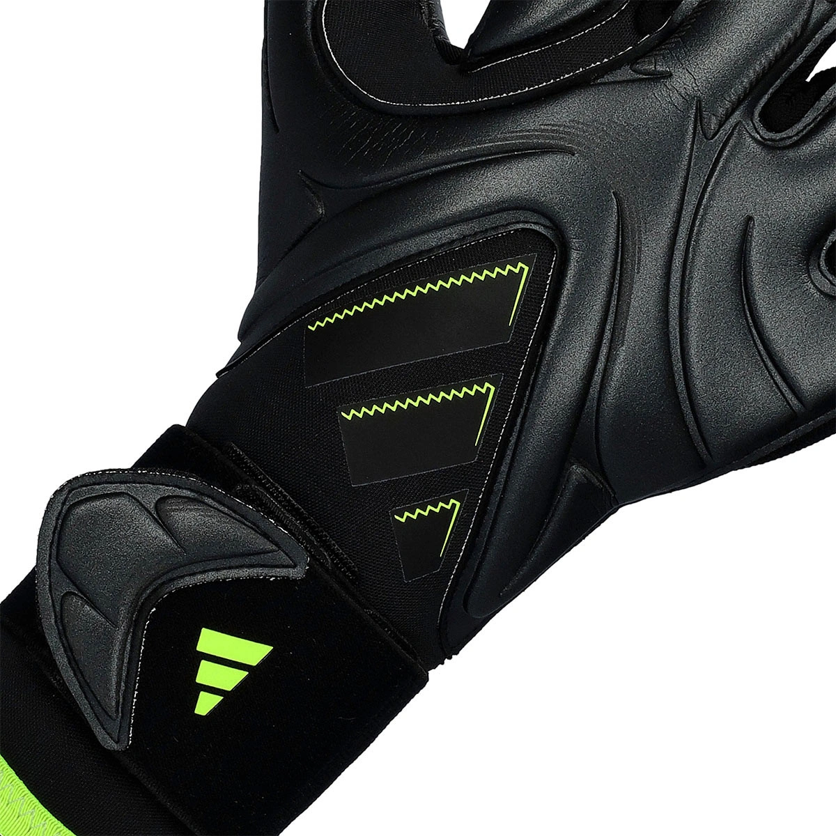 Guanti della marca adidas Copa Pro. Disponibili nella colorazione Black-Carbon-Lucid lemon e montati su un taglio negativo.
