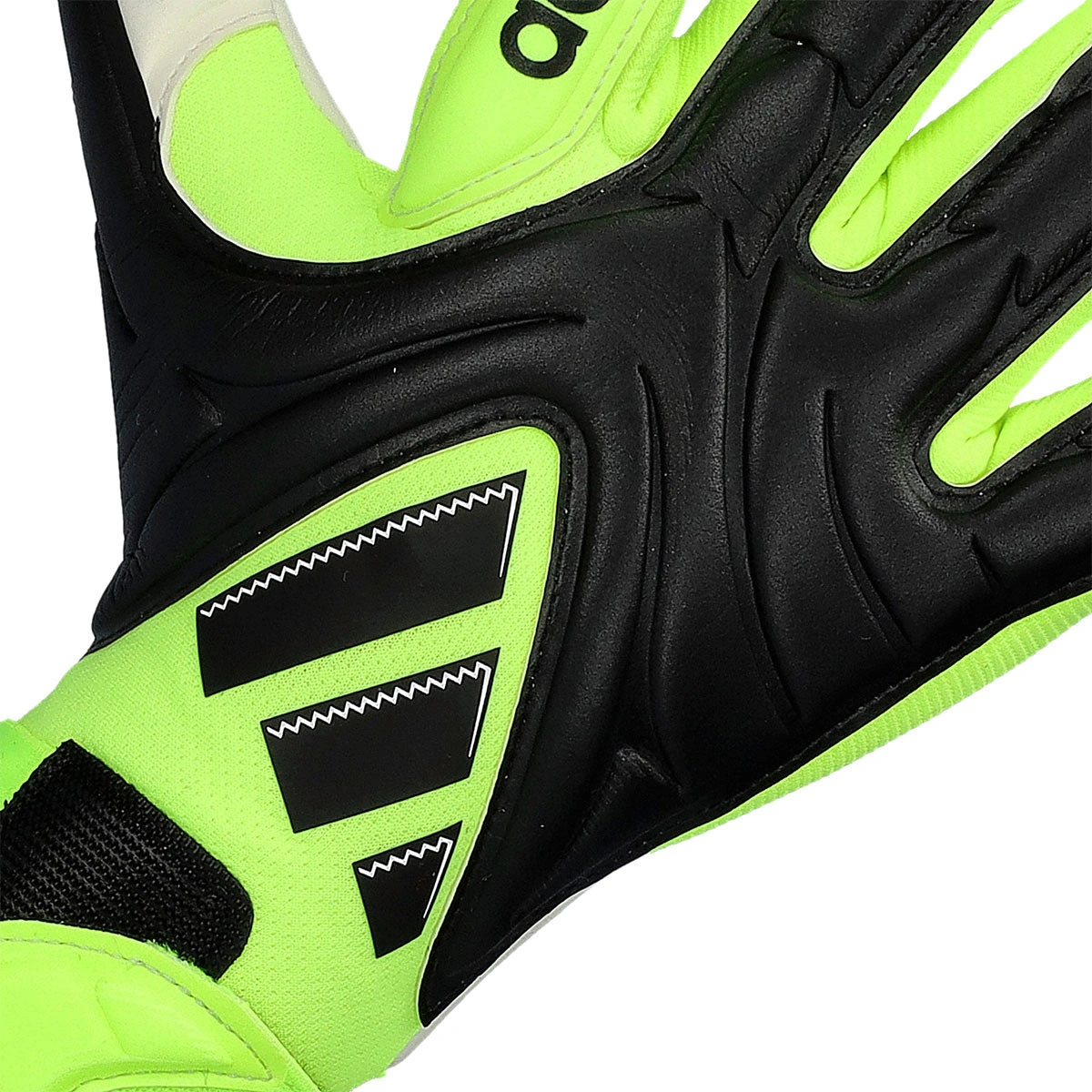 Guanti da portiere per bambini Copa Pro. Della marca adidas e disponibili nella colorazione Black-Lucid lemon, montati su un taglio negativo.