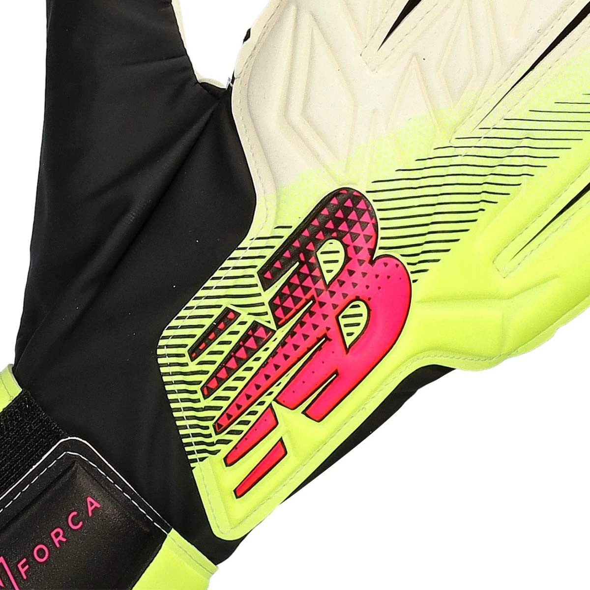 Guanti da portiere Nforca Replica della marca New Balance. Per adulti e di taglio Flat, disponibili nella colorazione White-Hi-lite.