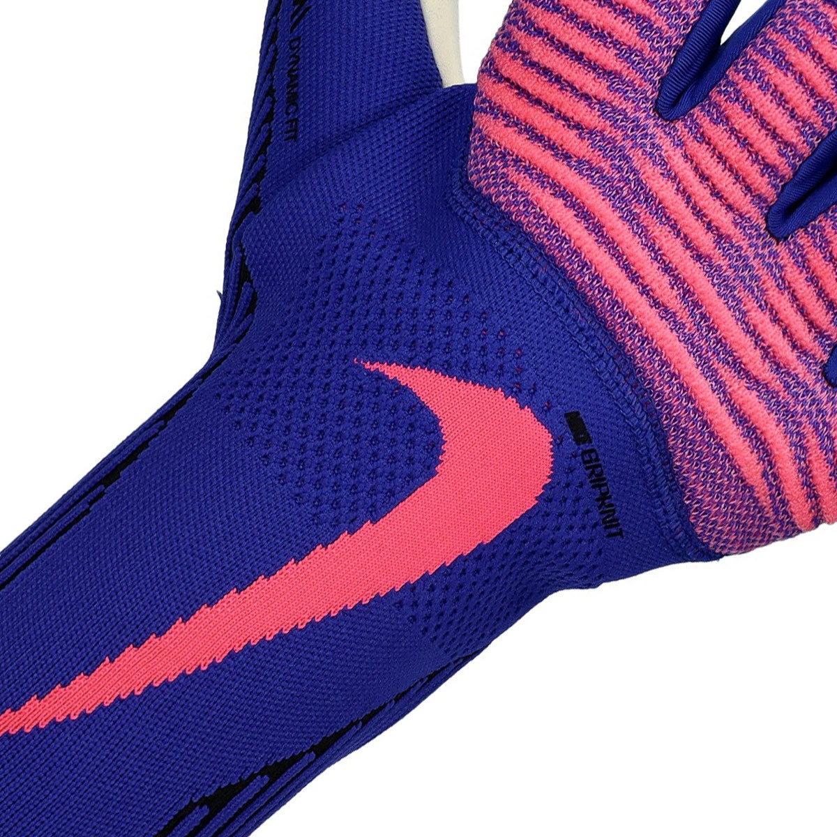 Guanti da portiere Phantom Dynamic Fit della marca Nike per adulti e disponibili nella colorazione Racer blue-black-pink blast, montati su un taglio negativo.