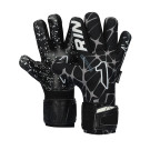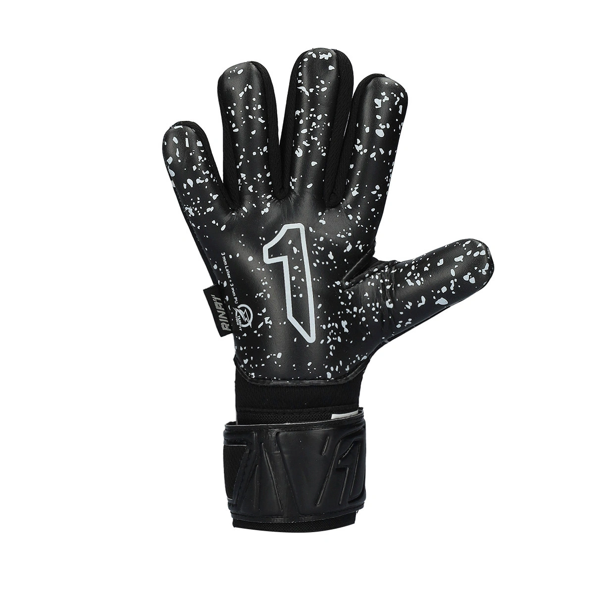 Guanti da portiere per bambini Santoloco As. Modello della marca Rinat di colore nero e montato su un taglio negativo.