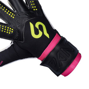 Guanti da portiere Pantera Base della marca SP. Guanti di colore nero e rosa montati su un taglio rollfinger.