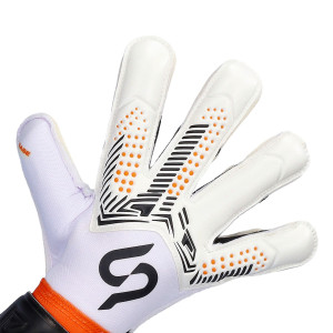 Guanti da portiere Pantera Base per bambini della marca SP, di colore bianco e arancione. Montati su un taglio rollfinger.
