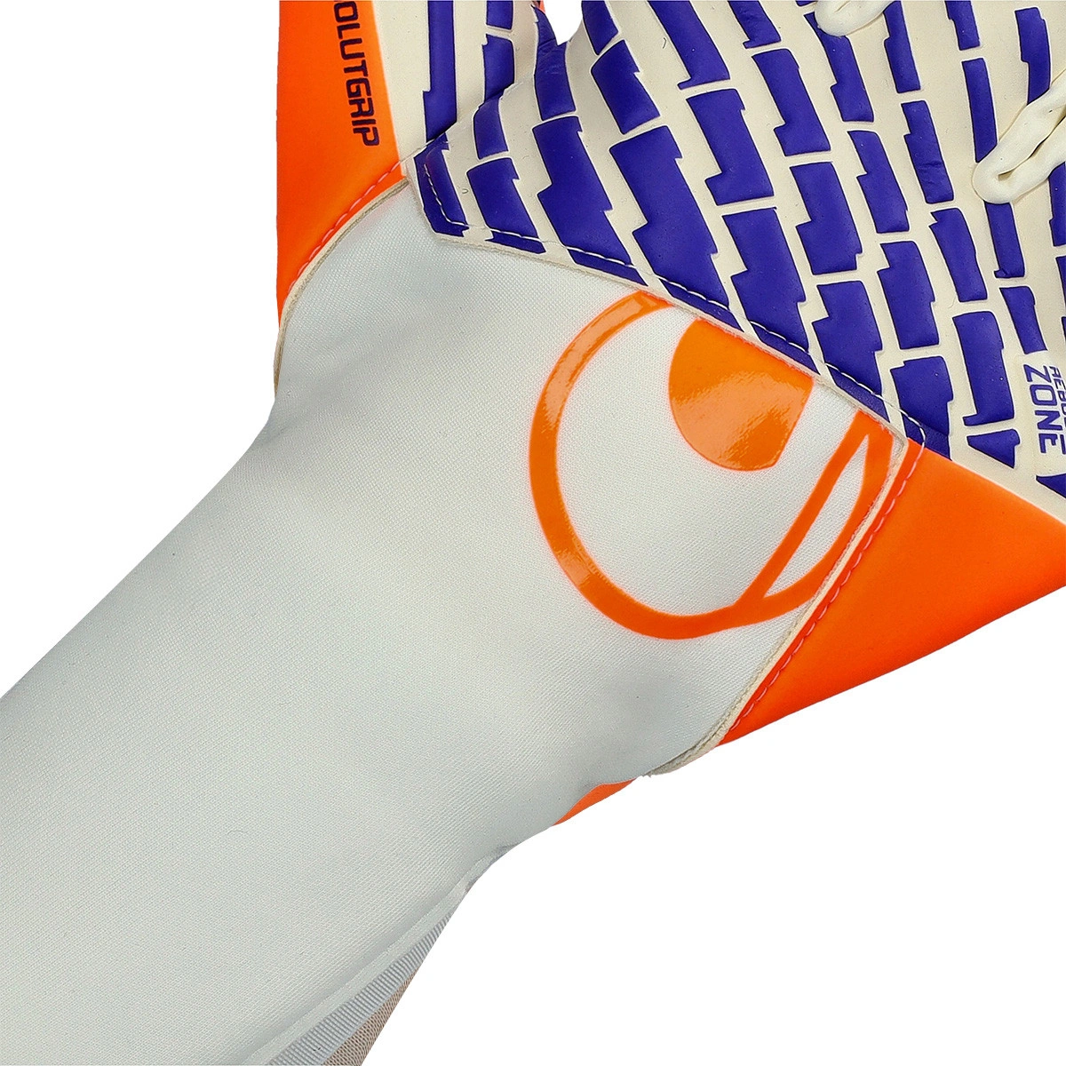 Guanti da portiere Fangmaschine Cybertec Absolutgrip Hn Fit della marca Uhlsport. Modello per adulto e disponibili nella colorazione White-Orange-Blue, con taglio negativo.