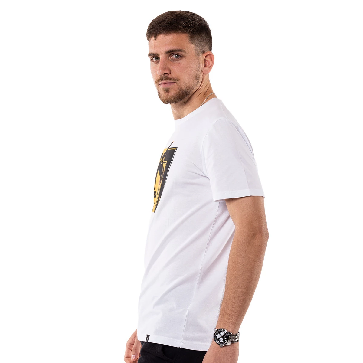 100% cotone organico e molto piacevole al tatto. Stampa frontale in colore giallo di una delle