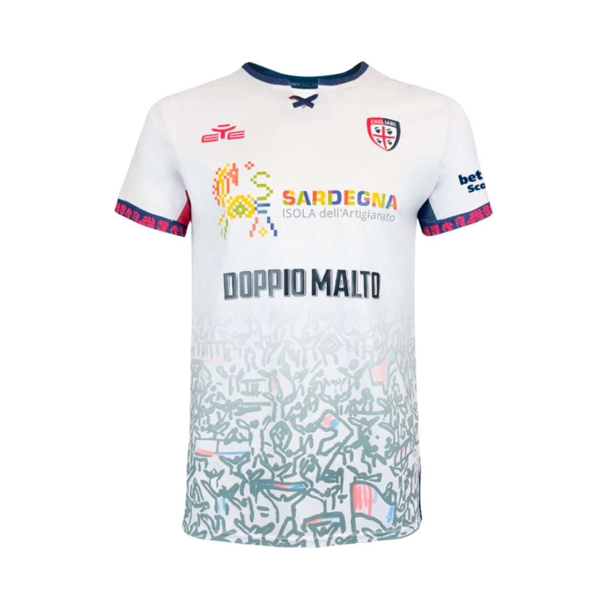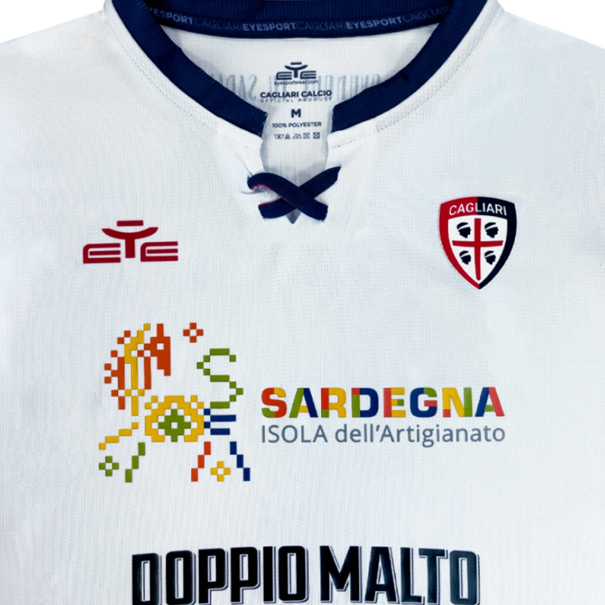 maglia Away del Cagliari 2025-2026 del marchio EyeSport è molto più di un semplice capo: è un autentico tributo alla passione e allo spirito del club. Con un modello da gara originale, questa maglia riesce a cogliere tutta l'essenza della stagione 2025/26, unendo tradizione e innovazione al tempo stesso. Il design centrale si ispira alla famosa litografia "Ai Sardi" dell'artista Costantino Nivola. Il nostro studio di design ha reinterpretato un'immagine della tribuna dei tifosi del Cagliari con lo stile unico di Nivola, evocando il profondo legame tra la Sardegna e il Cagliari Calcio. Attorno alle maniche una sequenza di pittogrammi richiama le sculture moderniste dell'artista. Lungo l'orlo inferiore sono, invece, stampate le coordinate GPS del centrocampo dell'Unipol Domus.