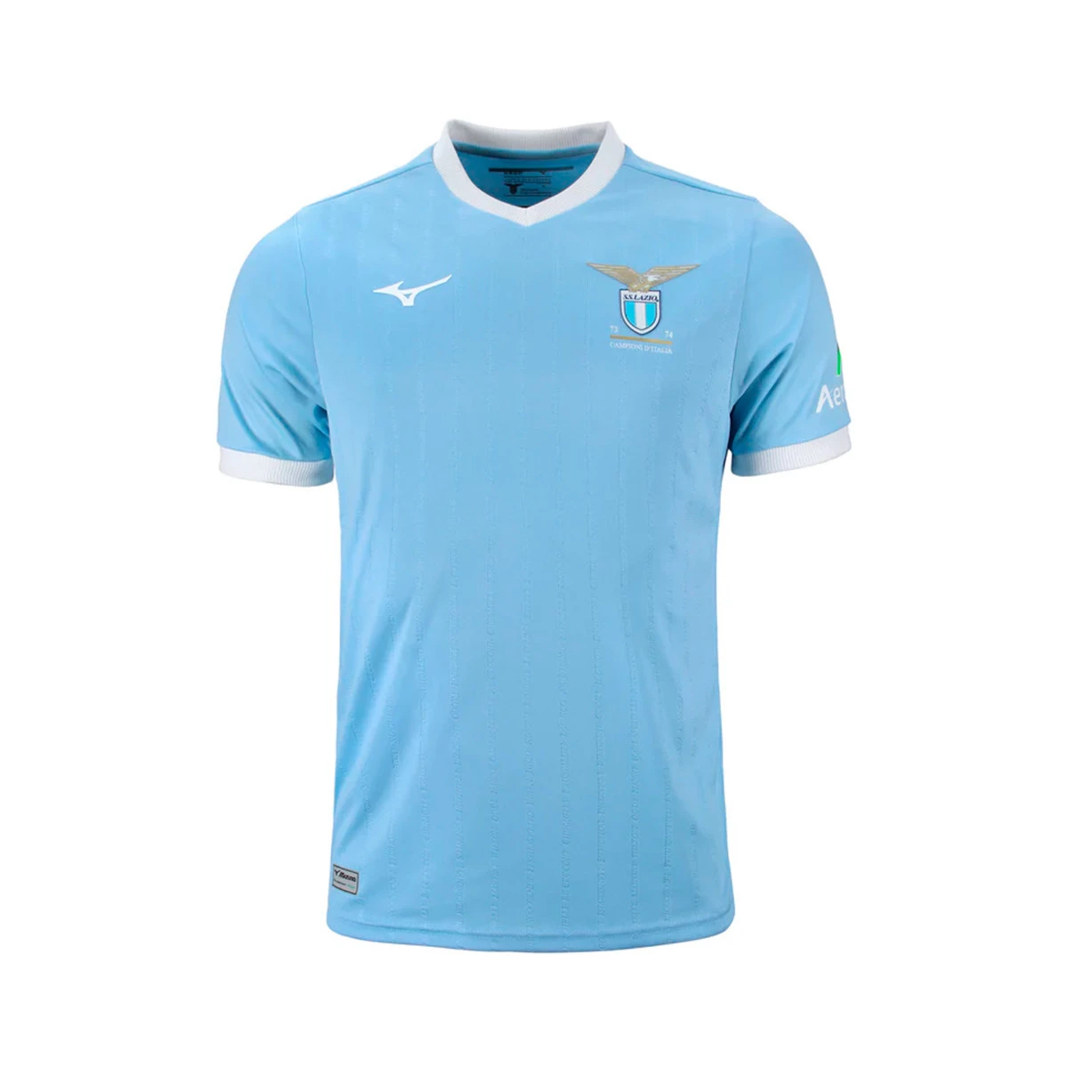 L'azzurro si ispira alla maglia degli anni '70 dando al capo un aspetto vintage insieme alla bordatura testurizzata sulle maniche e sullo scollo a V. La maglia celebrativa mostra orgogliosamente lo stemma della Lazio in rilievo al centro, con la scritta "Campioni d'Italia" sotto, all'interno di una confezione assolutamente esclusiva.