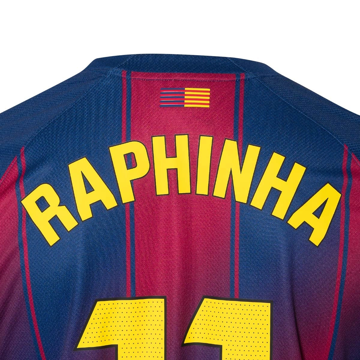 Prima divisa del Barcellona per la stagione 2025 2026 con serigrafia inclusa di Raphinha #11. Progettato da Nike, questo capo incarna lo spirito del talentuoso giocatore brasiliano e futuro idolo blaugrana.