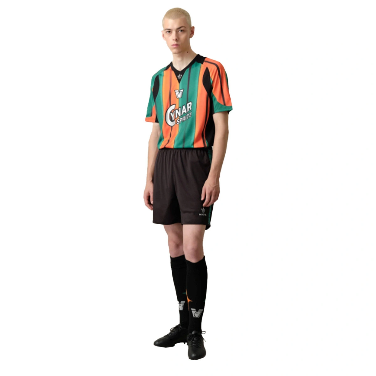 Con un modello informale a maniche corte e un discreto scollo a V è una fusione di tradizione e modernità. Strisce arancioni e verdi intense attraversano il corpo, esaltate da delicate sfumature nere che donano ritmo e profondità, mentre i pannelli laterali in mesh garantiscono traspirazione e comfort. All'altezza del petto spicca il luminoso logo argentato "Cynar Spritz" insieme allo stemma del Venezia e al logo NOCTA al centro e in un perfetto equilibrio.