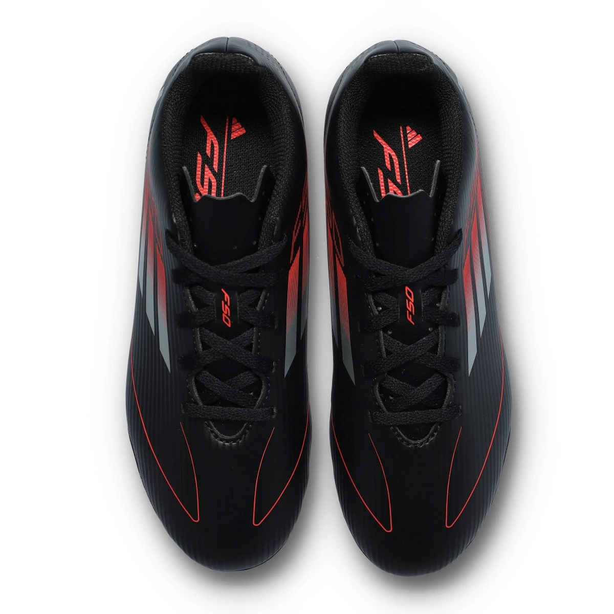 Scarpe F50 Club FG/MG per bambini della marca adidas e disponibili nella colorazione Core Black-Iron Met-Lucid Red. Di gamma base e adatte a campi in erba naturale.
