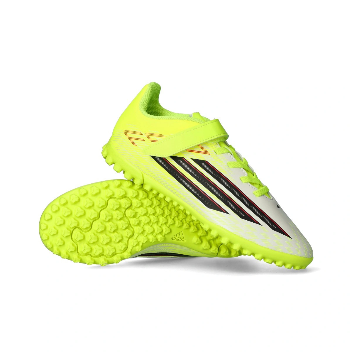 Scarpe da calcio per bambini F50 Club H&L Turf della marca adidas e disponibili nella colorazione Team Solar Yellow-Core Black-Lucid Red. Di gamma base per moquette o campi in erba sintetica di seconda generazione.