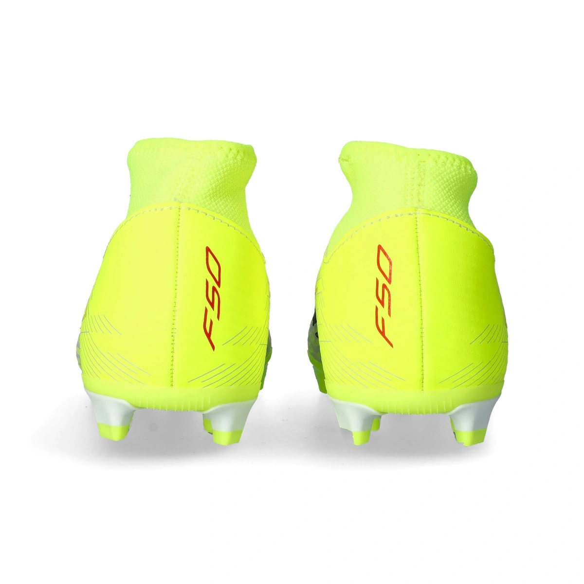 Scarpe da calcio per bambini F50 Club Mid FG/MG della marca adidas e disponibili nella colorazione Team Solar Yellow-Core Black-Lucid Red. Di gamma base anche per campi in erba naturale.
