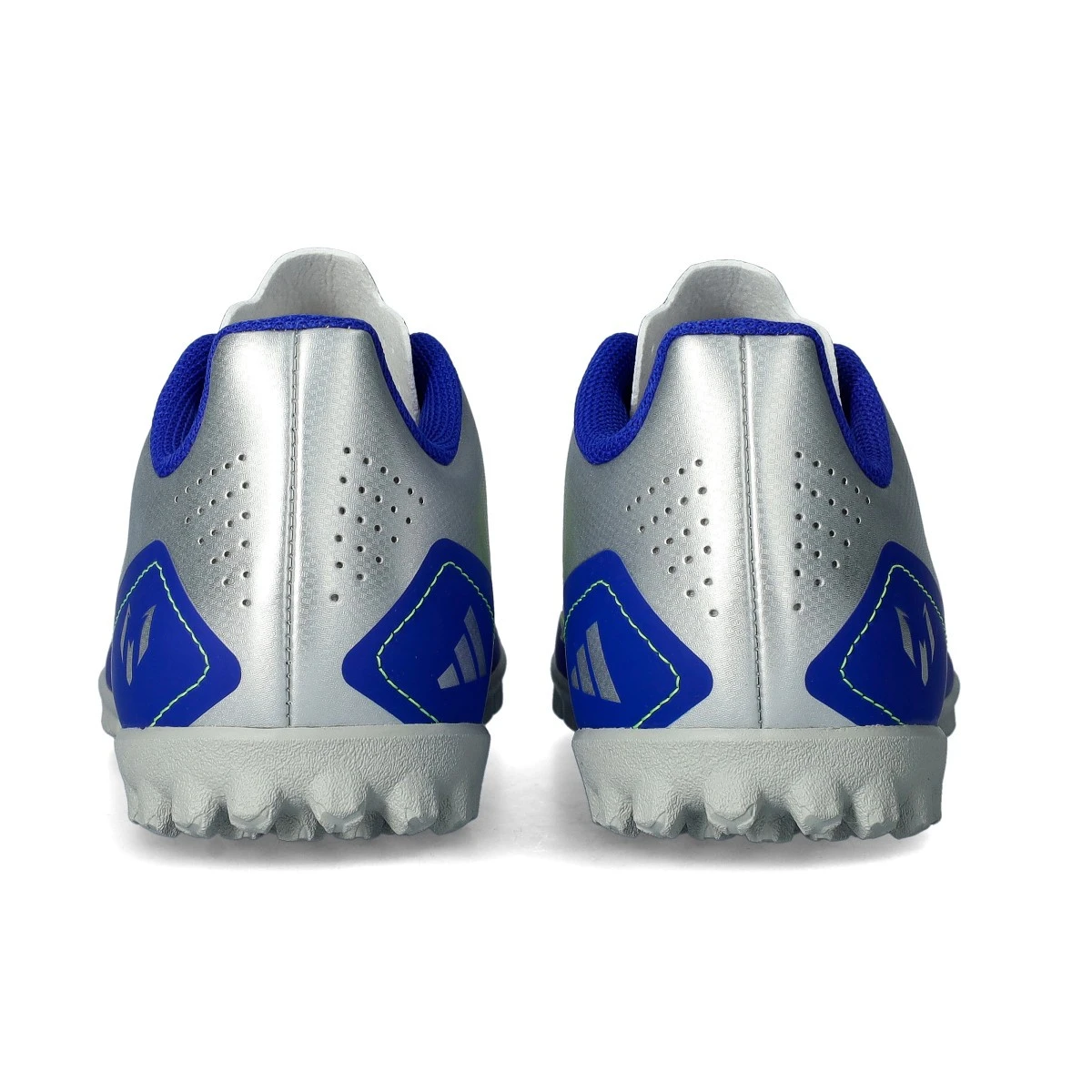 Scarpe da calcio per bambini F50 Club Turf Messi per bambini della marca adidas e disponibili nella colorazione Silver Met-Solar Yellow-Lucid Blue. Di gamma base e per terreni in erba sintetica.
