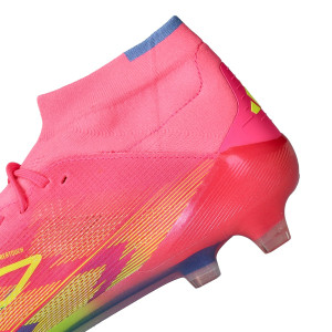 Scarpe da calcio femminili adidas Elite Mid FG. D'alta gamma, adatte a campi in erba naturale, e disponibili nella colorazione Lucid Pink-Lucid Lemon-Blue Fusion.