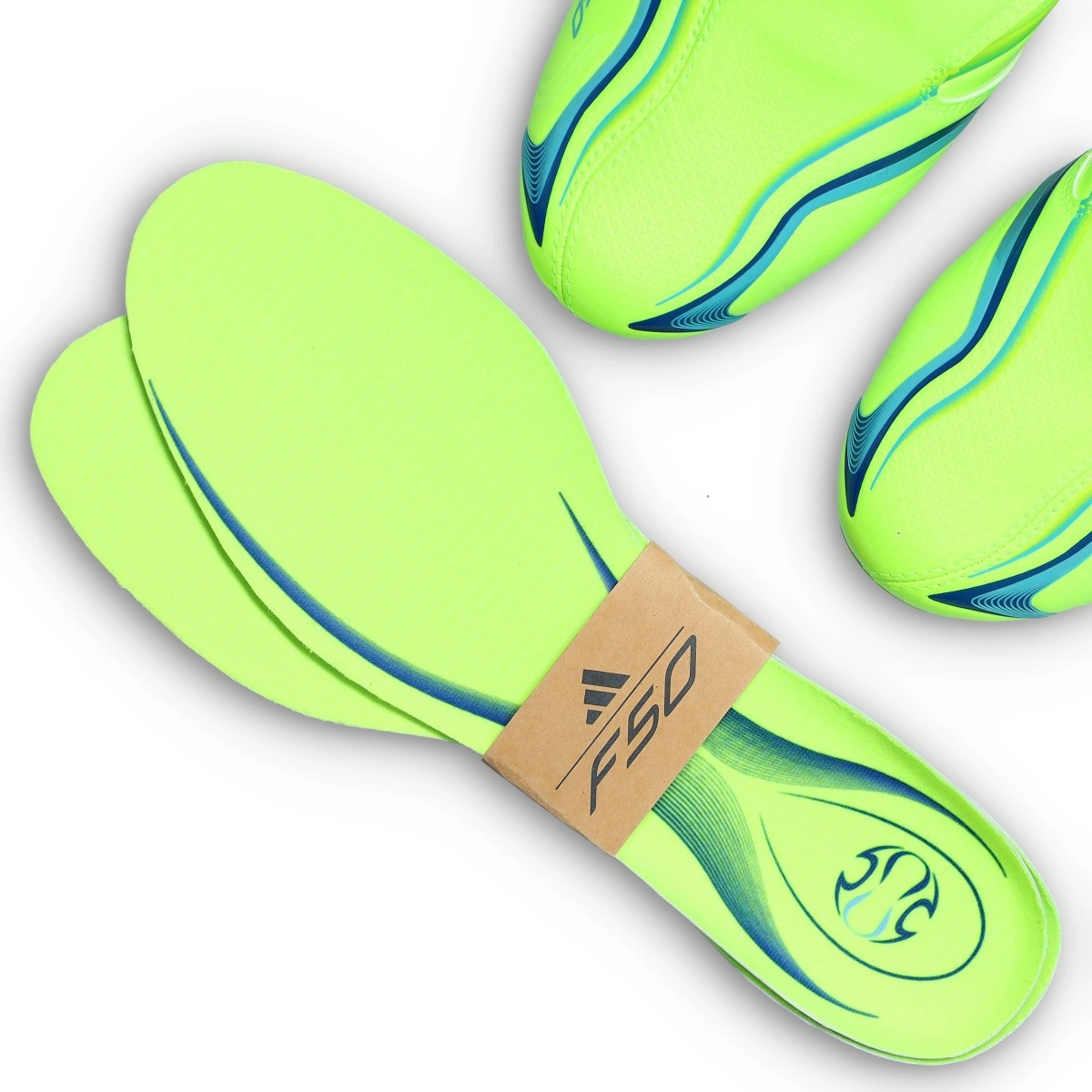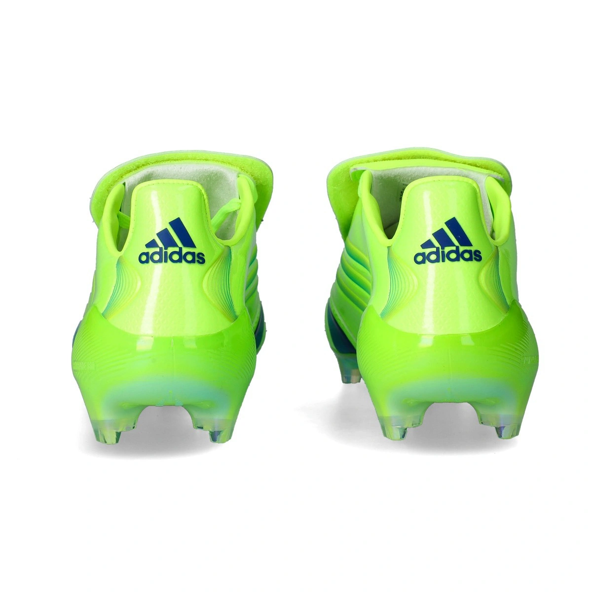 Scarpe da calcio F50 Elite FG Tunit del marchio adidas per campi in erba naturale. Di gamma alta con lacci e disponibili nel colore Lucid Lemon-Team Royal Blue-Lucid Aquamarine.
