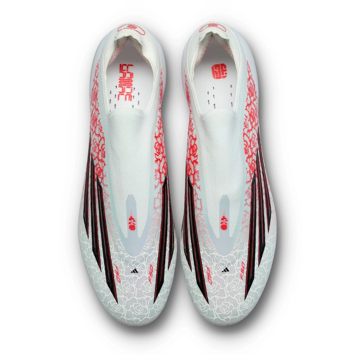 Scarpe da calcio adidas F50 Elite LL FG Lamine Yamal. Senza lacci, da utilizzare su campi in erba naturale asciutti o bagnati. Di alta gamma e disponibili nella colorazione White-Core-Black-Lucid red.