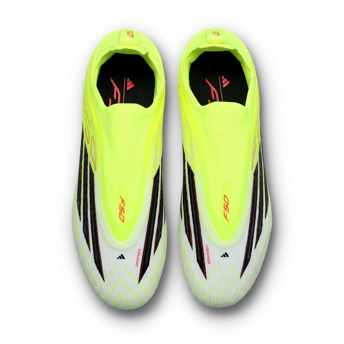 Scarpe da calcio per bambini adidas F50 Elite LL FG. In filato, senza lacci, da usare su campi in erba naturale asciutta o bagnata. Di gamma alta e disponibili nella colorazione Team Solar Yellow-Core Black-Lucid Red.