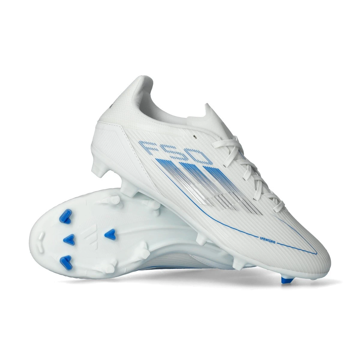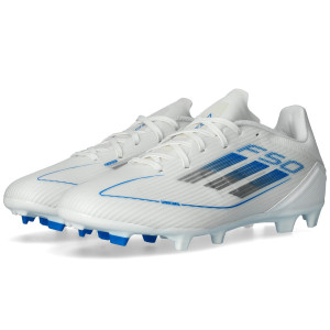 Scarpe da calcio F50 League FG/MG della marca adidas e disponibili nella colorazione White-Silver Met-Ftwr White. Di gamma base adatte a giocare su campi in erba naturale.