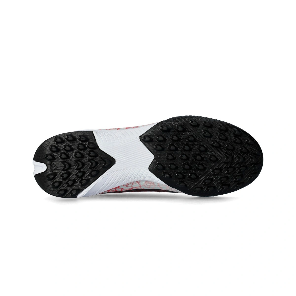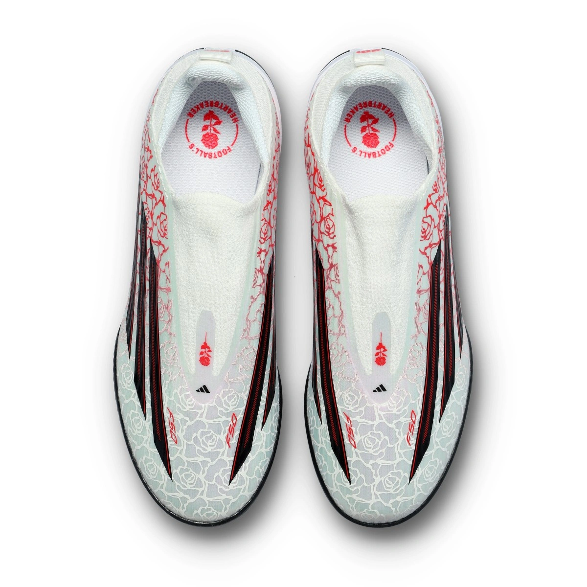 Scarpe da calcio per bambini F50 League LL Turf Lamine Yamal del marchio adidas e disponibili nella colorazione White-Core-Black-Lucid red. Di gamma base senza lacci per moquette o erba sintetica.