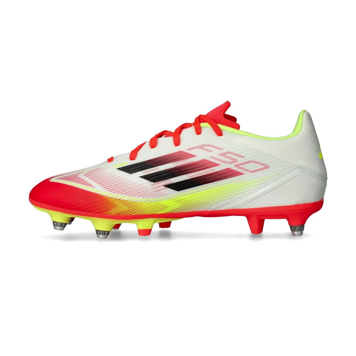 Scarpe da calcio F50 League SG della marca adidas e disponibili nella colorazione White-Coral Black-Solar Yellow per terreni bagnati o molto fangosi.