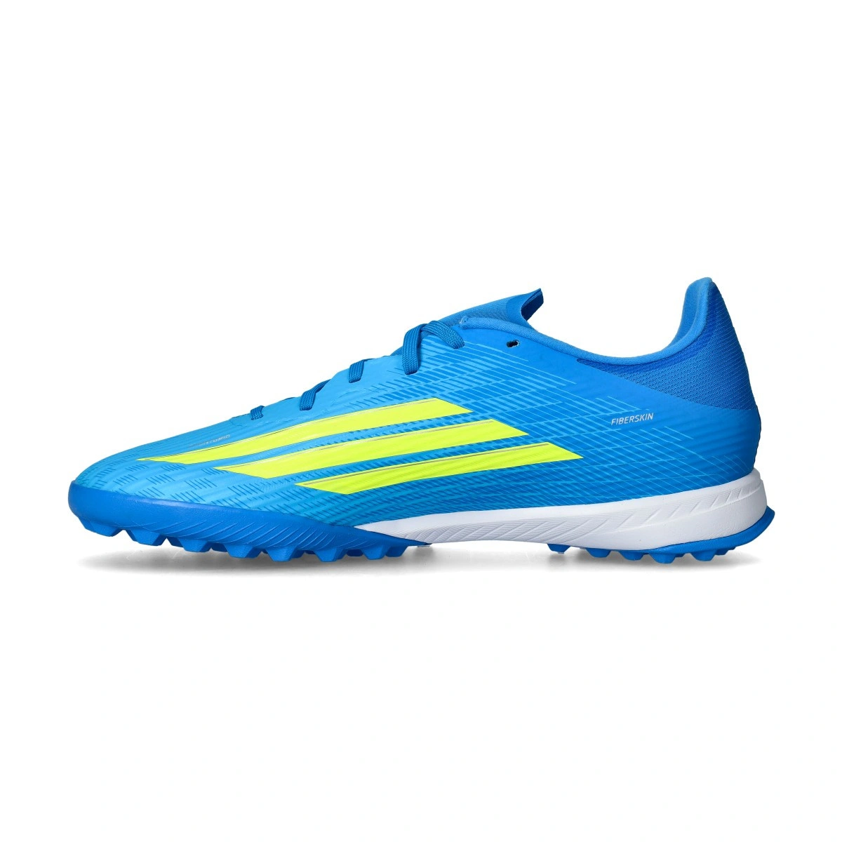 Scarpe da calcio F50 League Turf del marchio adidas e disponibili nella colorway Lucid Ray Blue-Team Solar Yellow-Lucid Aqua. Di gamma base, per moquette e per campi in erba artificiale.
