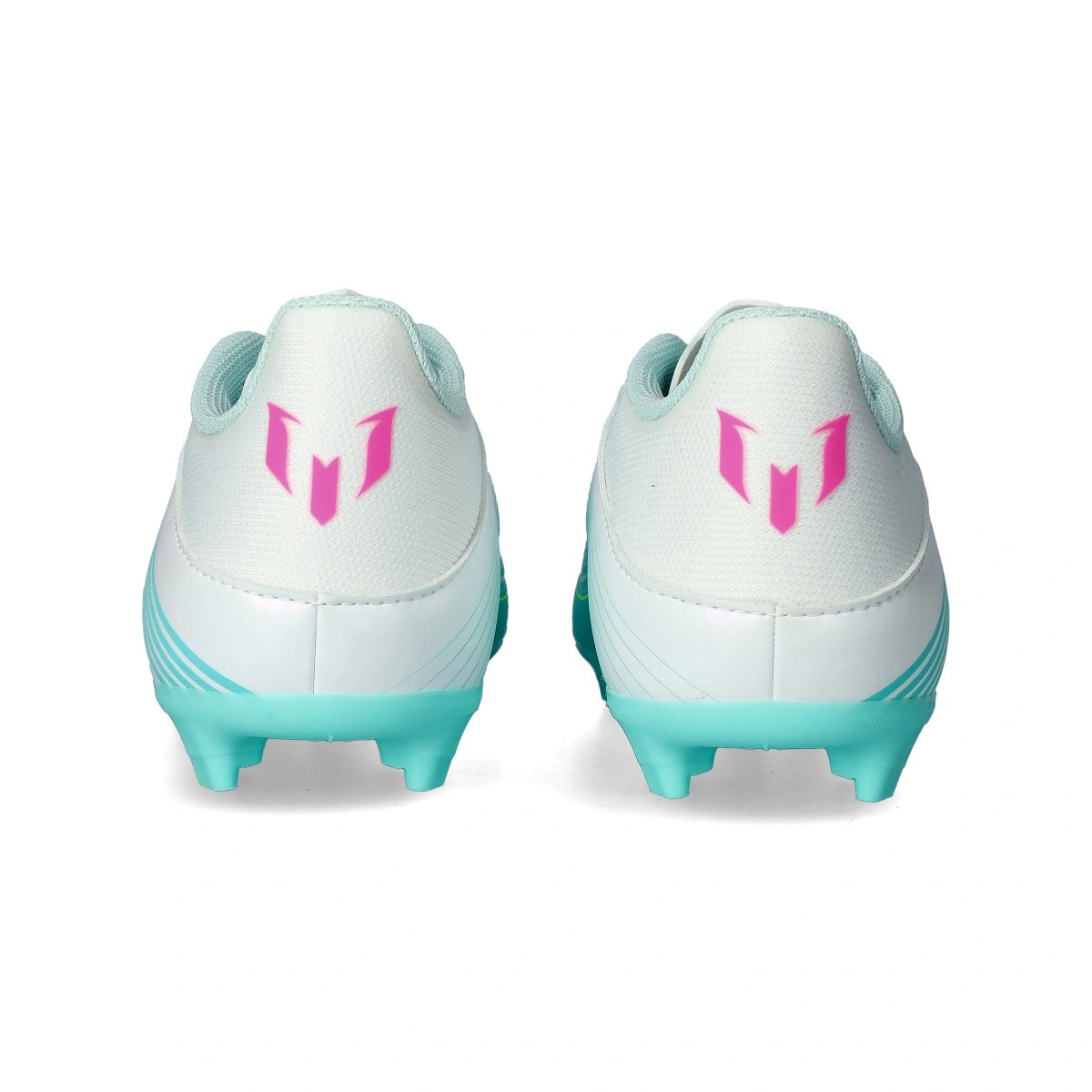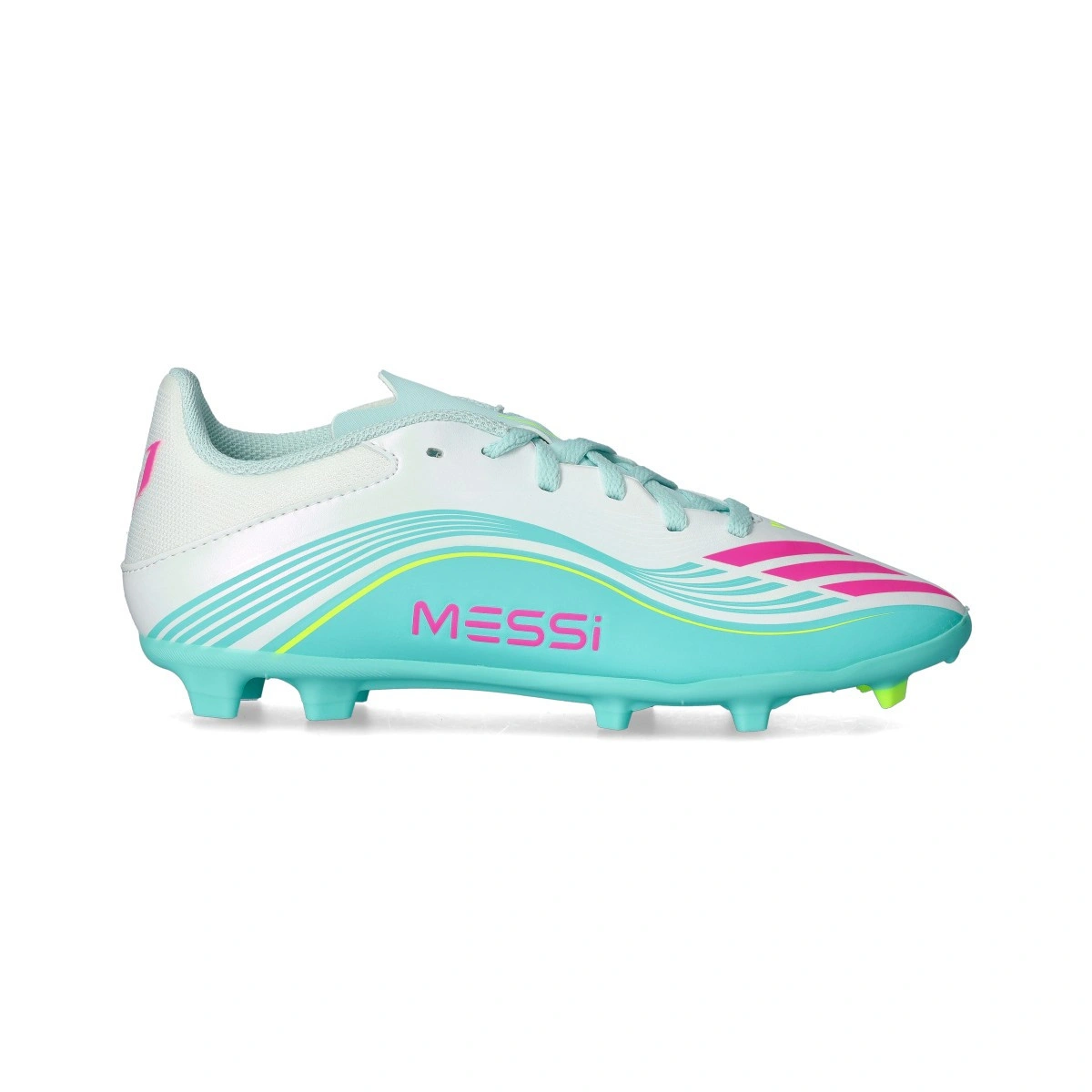 Scarpe da calcio League FG/MG Messi per bambini del marchio adidas e disponibili nella colorazione White-Lucid Pink-Flash Aqua. Di gamma base anche per terreni in erba naturale.