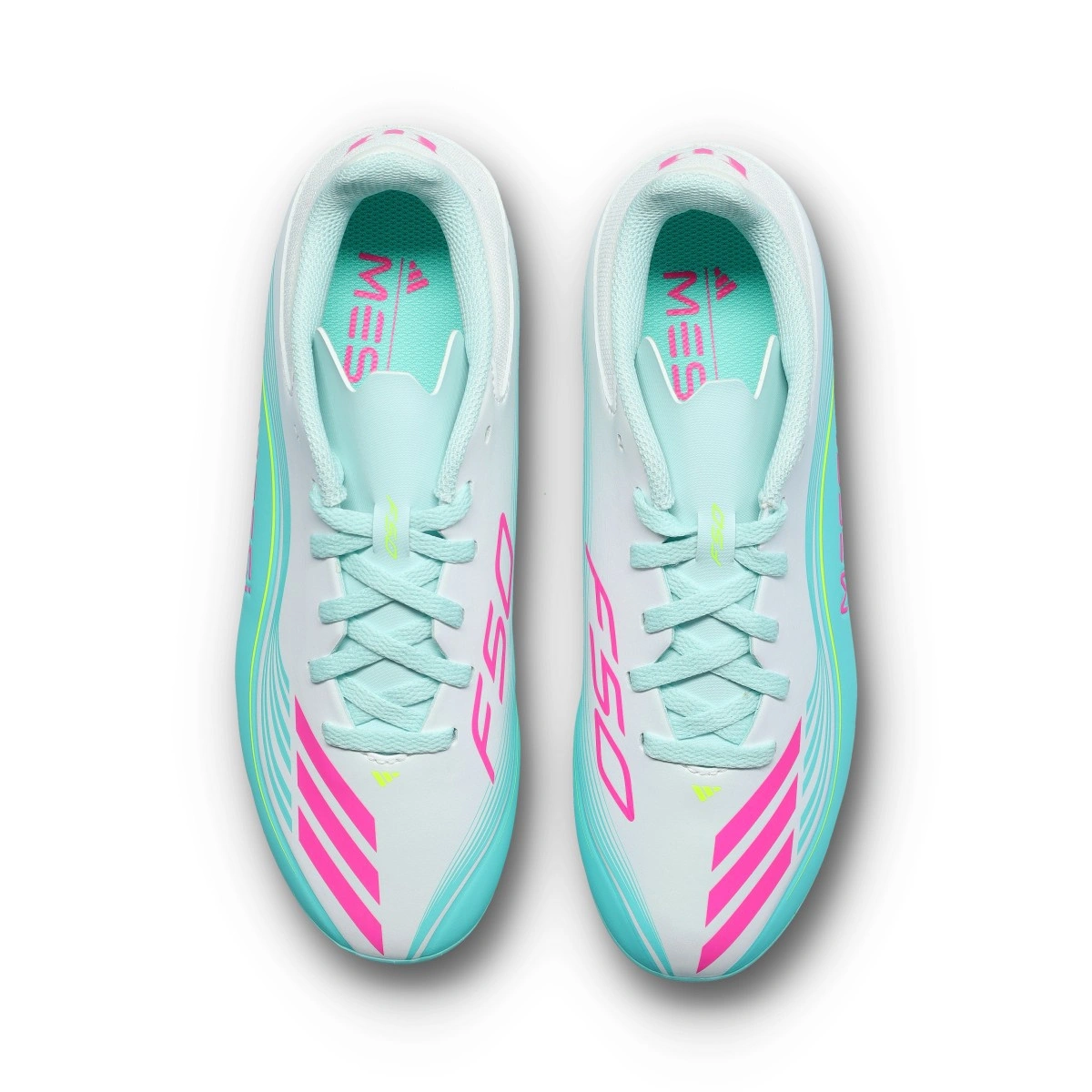 Colore, ritmo e velocità. Questo speciale pack delle adidas F50 nasce ispirato alle Miami Vibes: tonalità corallo, turchese e dettagli fluo che ricordano l'estate eterna, il calcio senza pressioni e lo spettacolo costante. Un'estetica fresca e accattivante che si adatta perfettamente allo stile allegro e deciso di Lionel Messi.