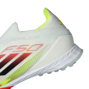 Scarpe F50 Pro Turf della marca adidas per moquette o campi in erba sintetica. Disponibili nella colorazione White-Core Black-Solar Yellow.