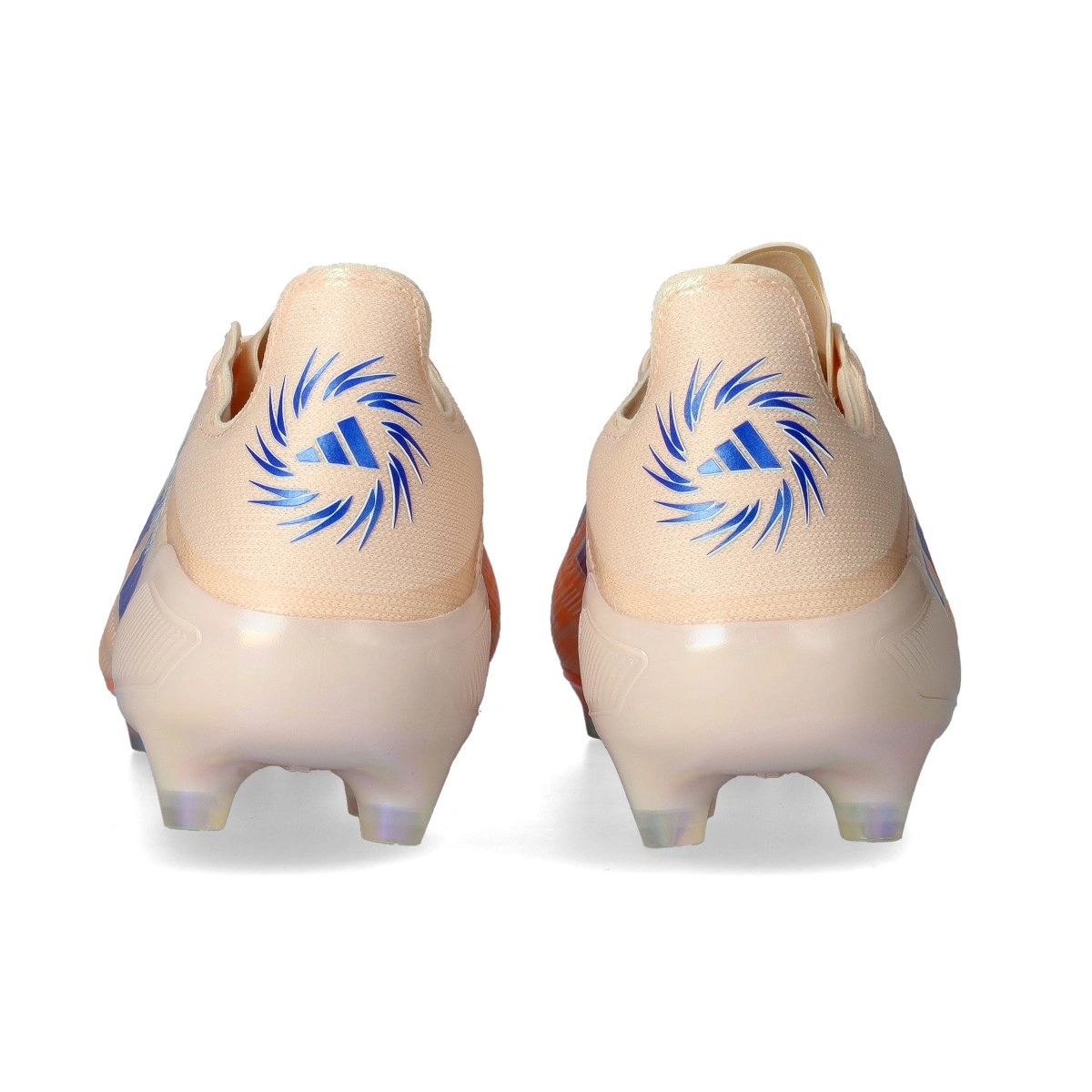 Scarpe da calcio femminili adidas F50 Elite L FG/AG. In filato, con lacci da utilizzare su campi in erba naturale e sintetica. Scarpe di alta gamma nella colorazione Bliss Orange-Lucid Blue-Beam Orange.