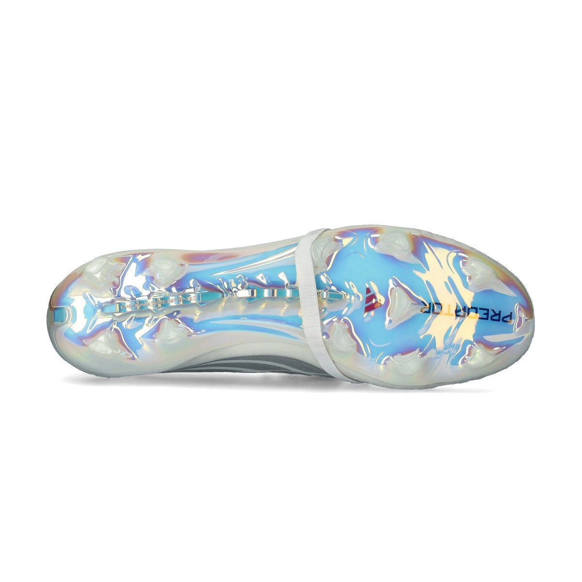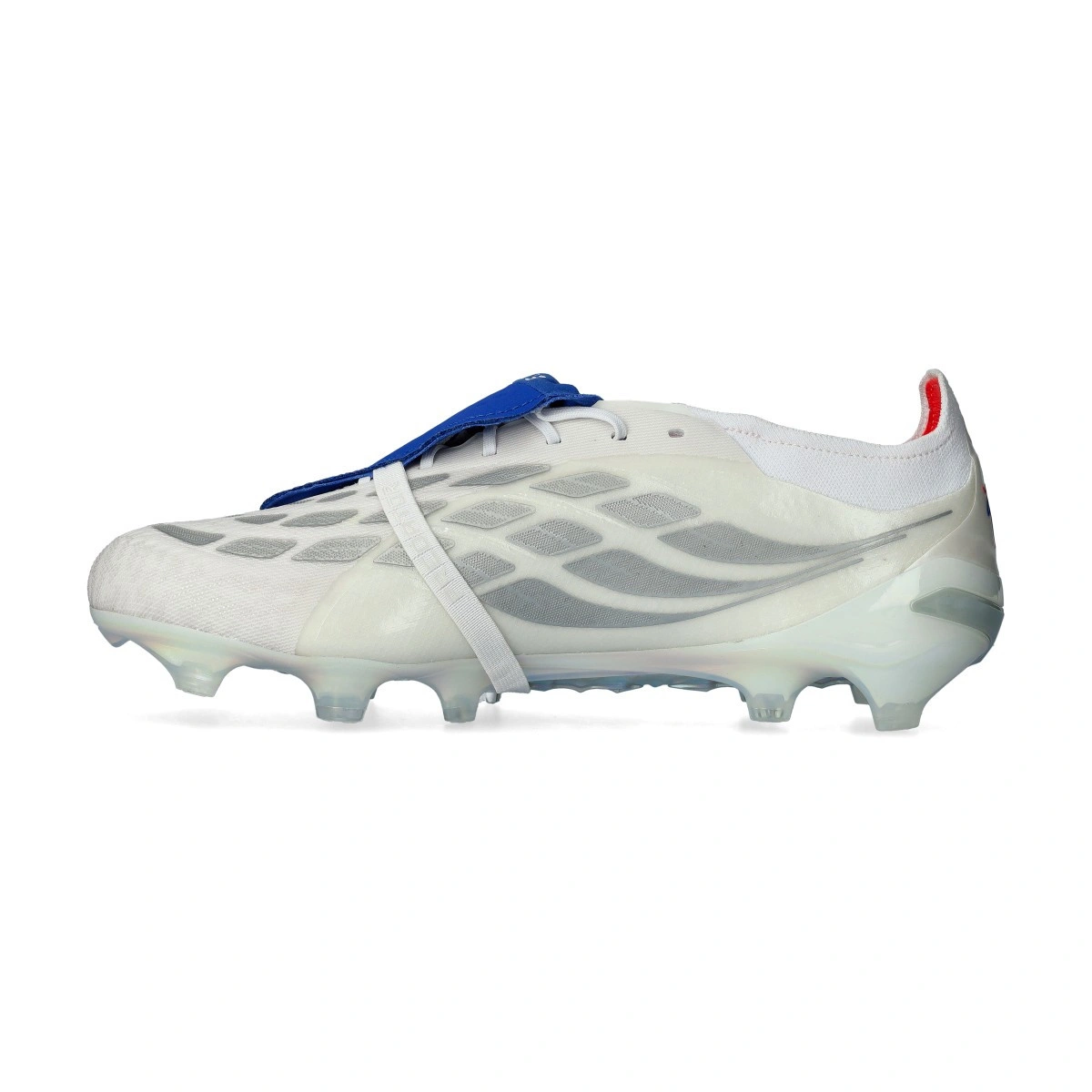 Scarpe da calcio adidas Predator Elite FT FG Jude Bellingham. Sintetiche, con lacci, da usare su campi in erba naturale. D'alta gamma e disponibili nella colorazione White-Zero Met-Team Royal Blue.