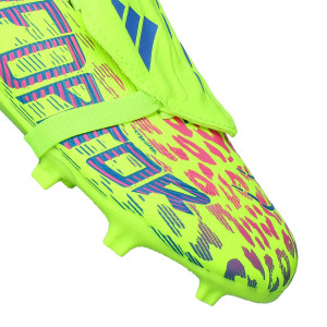 Scarpe da calcio per bambini adidas Predator League FT FG. Sintetiche, con linguetta da usare su campi in erba naturale. Di gamma media e disponibili nella colorazione Lucid Lemon-Lucid Pink-Blue Fusion.