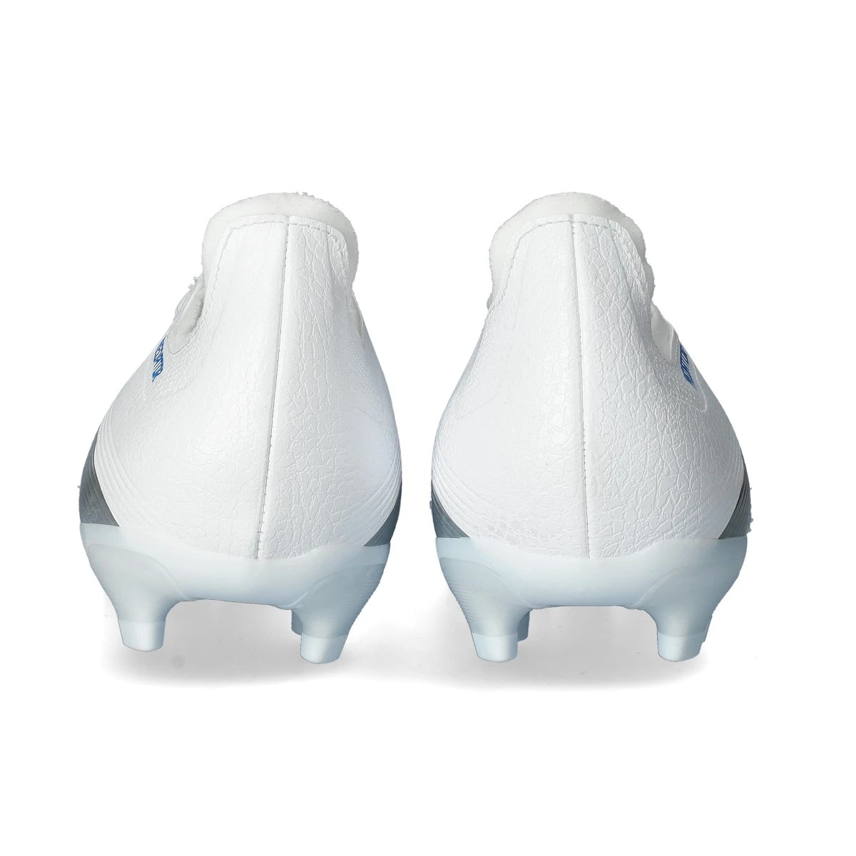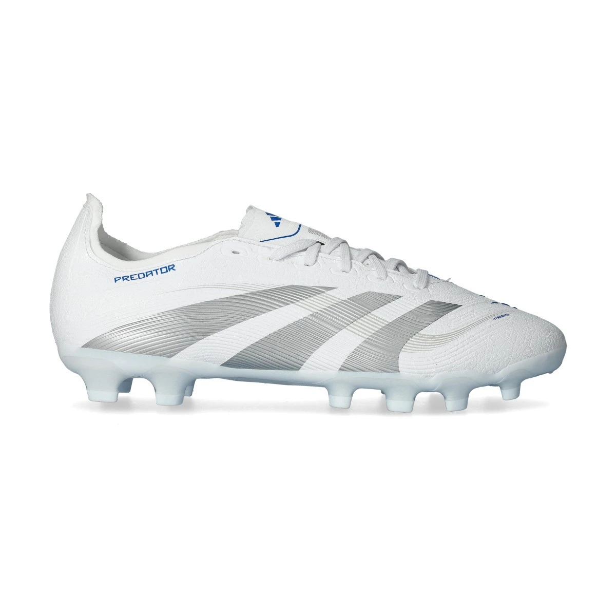 Scarpe da calcio Predator League L MG della marca adidas e disponibili nella colorazione White-Silver Met-Bright Royal. Di gamma base adatte a giocare su campi in erba sintetica, ma non solo.