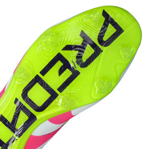 Scarpe da calcio Predator Pro L FG adatte a campi in erba naturale asciutta. Di gamma media e disponibili nella colorazione White-Lucid Pink-Lucid Lemon.
