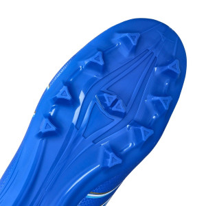 Scarpe da calcio Mizuno Αlpha Select con suola FG adatta a campi in erba naturale. Disponibili nella colorazione Laser Blue-White-Gold, per adulti e con lacci.