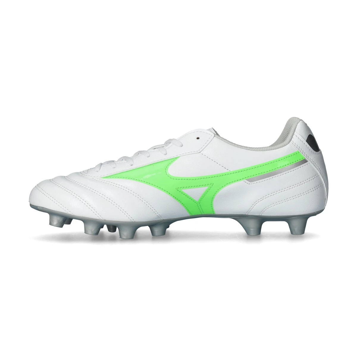 Scarpe da calcio Mizuno Morelia II Club FG per campi in erba naturale e disponibili nella colorazione White-Neon Green-Galaxy Silver. Di gamma base e adatte a terreni in erba naturale.