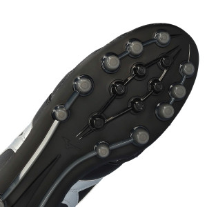 Scarpe da calcio Mizuno Morelia II Pro AG per terreni in erba sintetica e disponibili nella colorazione Black-Galaxy Silver-Dark Shadow. Adatte a giocatori di livello intermedio.