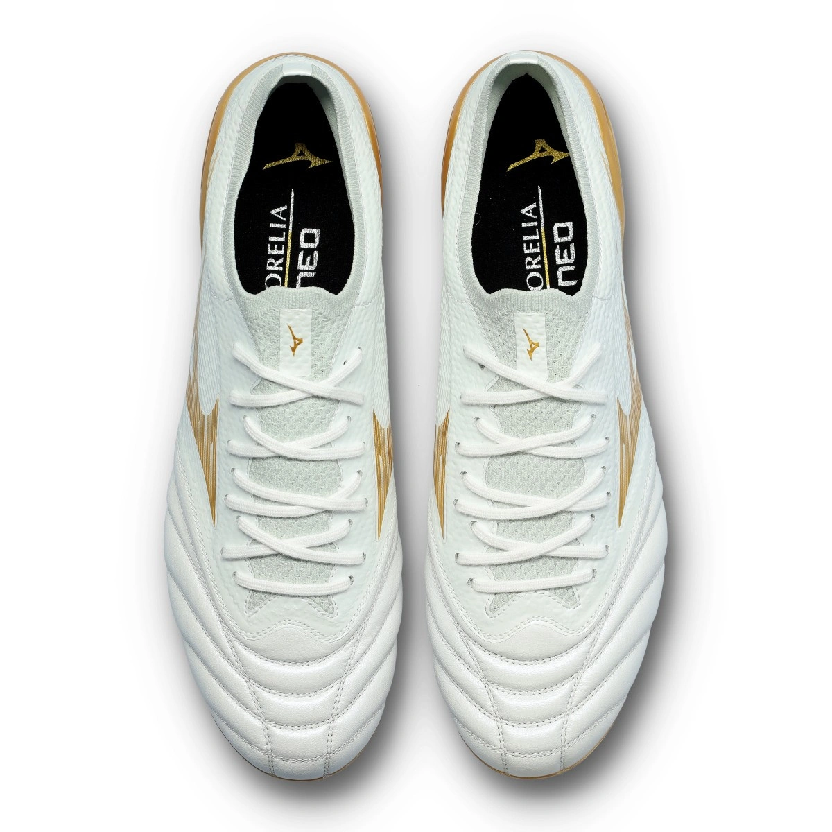 Scarpe da calcio in pelle di canguro Mizuno Morelia Neo IV Beta Elite Mix per campi in erba naturale bagnata e disponibili nella colorazione White-MP Gold-Cool Gray.