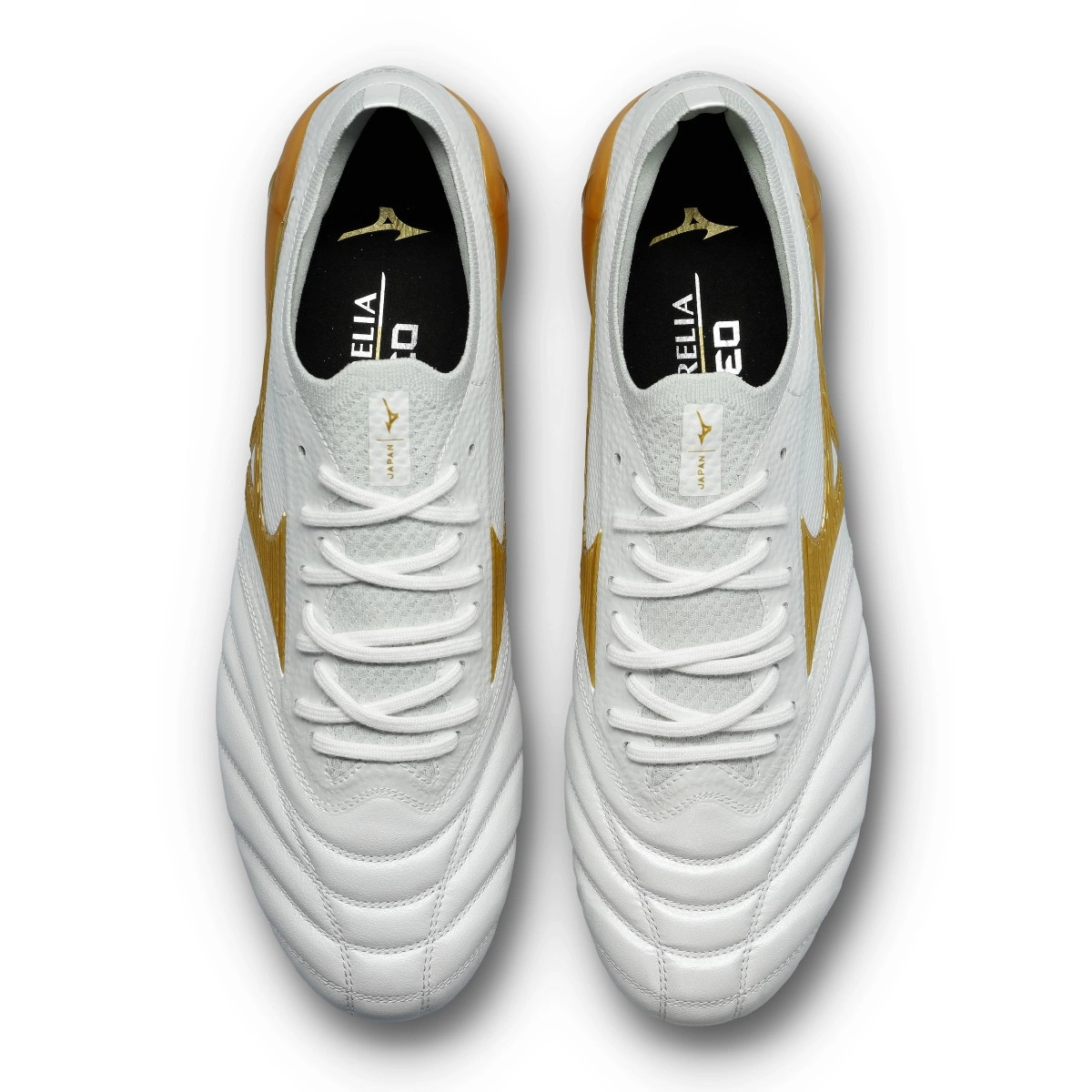 Scarpe da calcio in pelle di canguro Mizuno Morelia Neo IV Japan FG per erba naturale e disponibili nella colorazione White-Gold-Cool Gray.