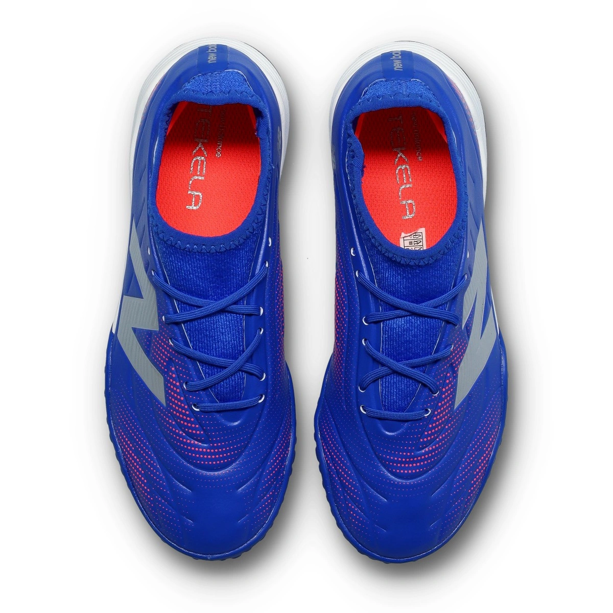 Scarpe da calcio per bambini New Balance Tekela Team Low Laced Turf V5. Nella colorazione Blue Gemstone, da usare su campi in moquette o in erba sintetica.