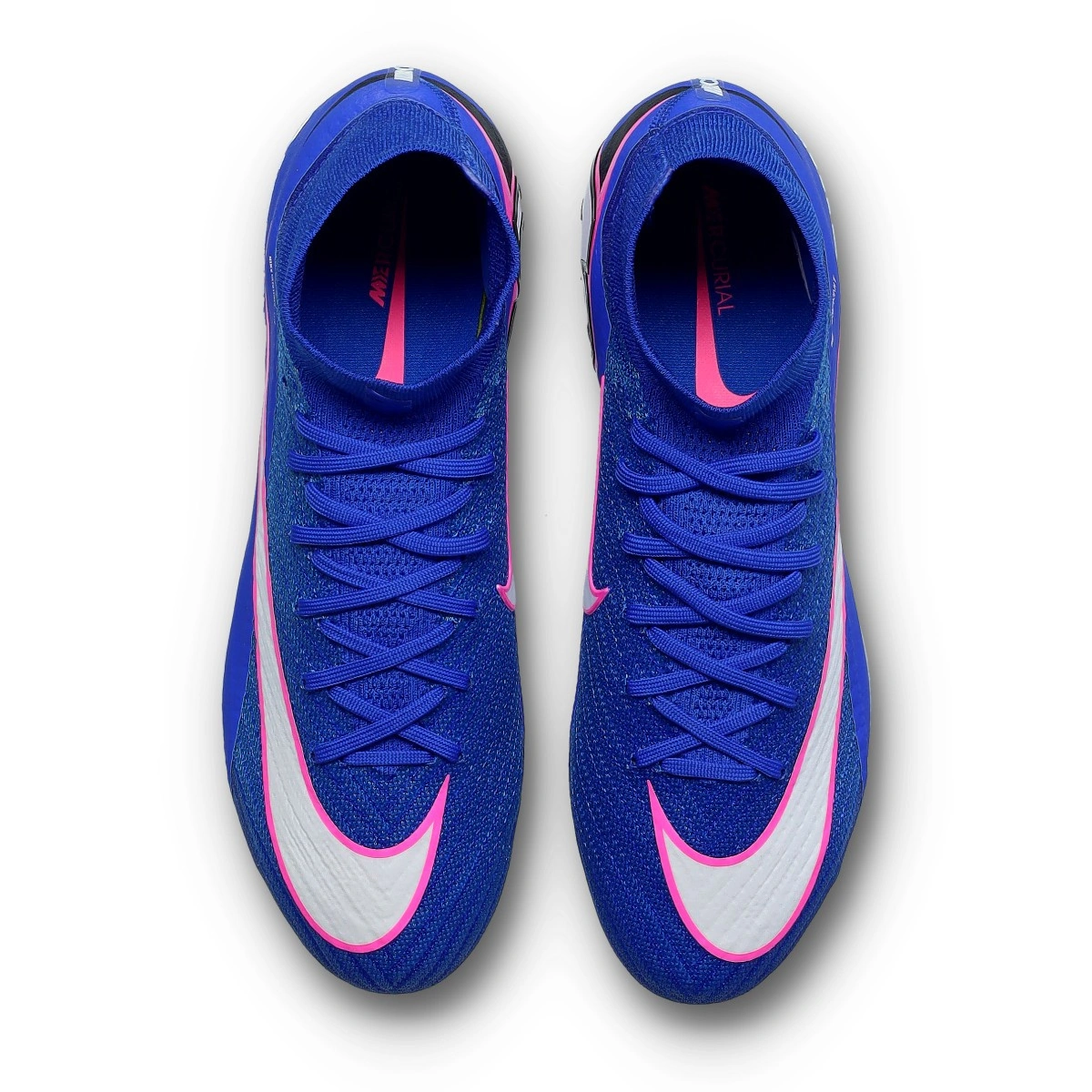 Scarpe da calcio per adulti Nike Air Zoom Mercurial Superfly 10 Elite SG-Pro. In filato, con calzino, da usare su campi in erba naturale molto bagnati. Di gamma alta per giocatori veloci e disponibili nella colorazione Racer Blue-White.