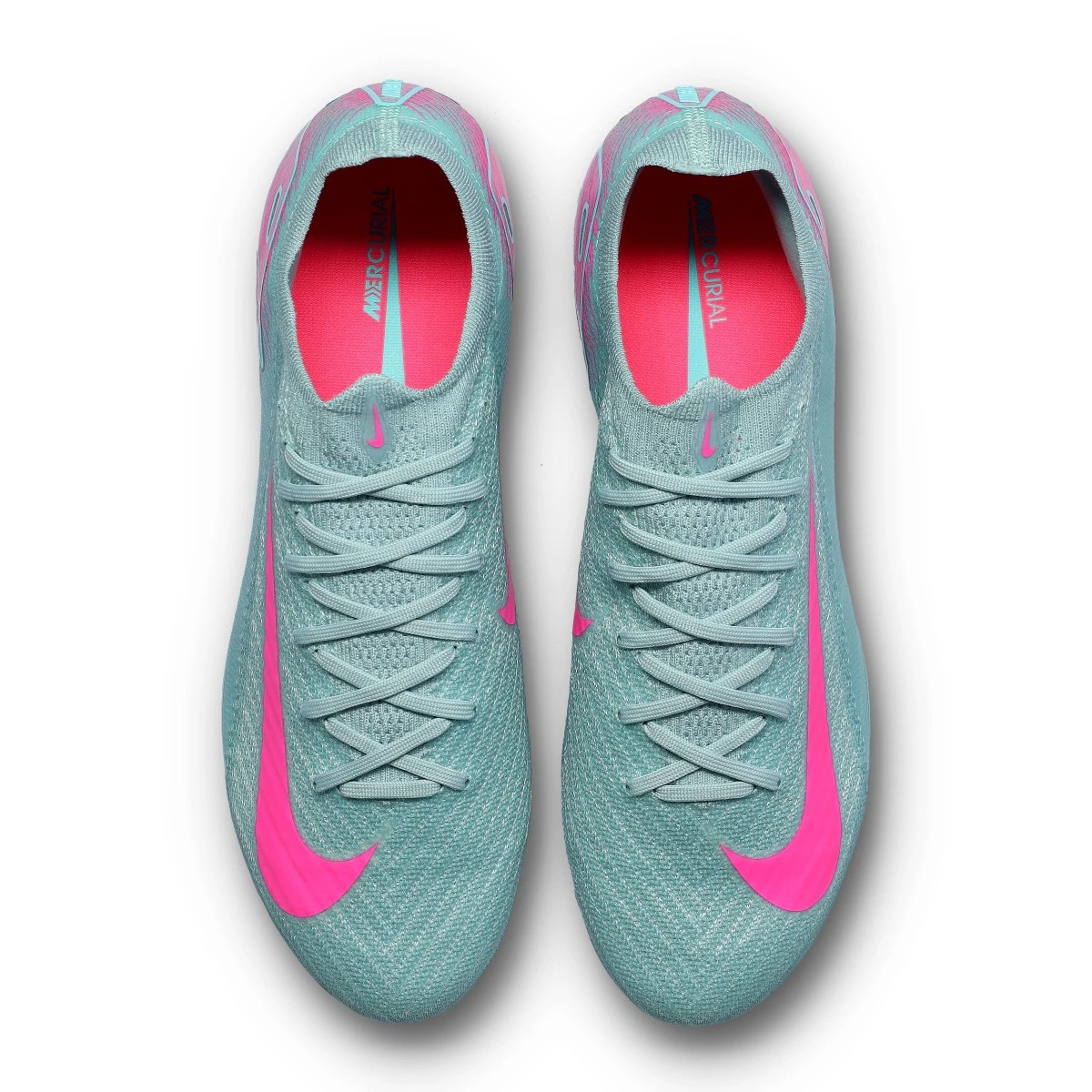 Scarpe da calcio Nike Air Zoom Mercurial Vapor 16 Elite SG-Pro per adulti. In filato, senza calzino, da usare su campi in erba naturale bagnata. D'alta gamma, per giocatori veloci, e disponibili nella colorazione Ocean Cube-Pink Blast.