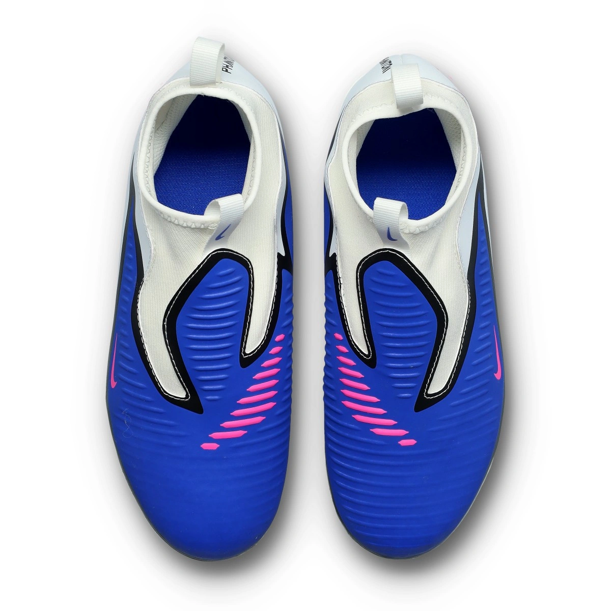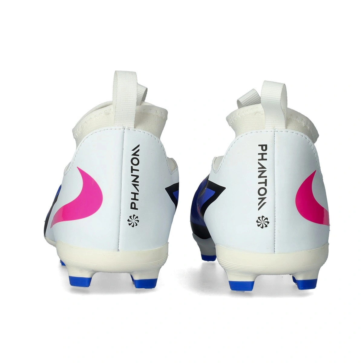 Scarpe da calcio per bambini Nike Phantom 6 High Academy FG/MG. In filato, con calzino, da usare su campi in erba naturale asciutta o sintetica di prima generazione. D'alta gamma, per giocatori che puntano su controllo e precisione, disponibili nella colorazione Racer Blue-Pink Blast-White.