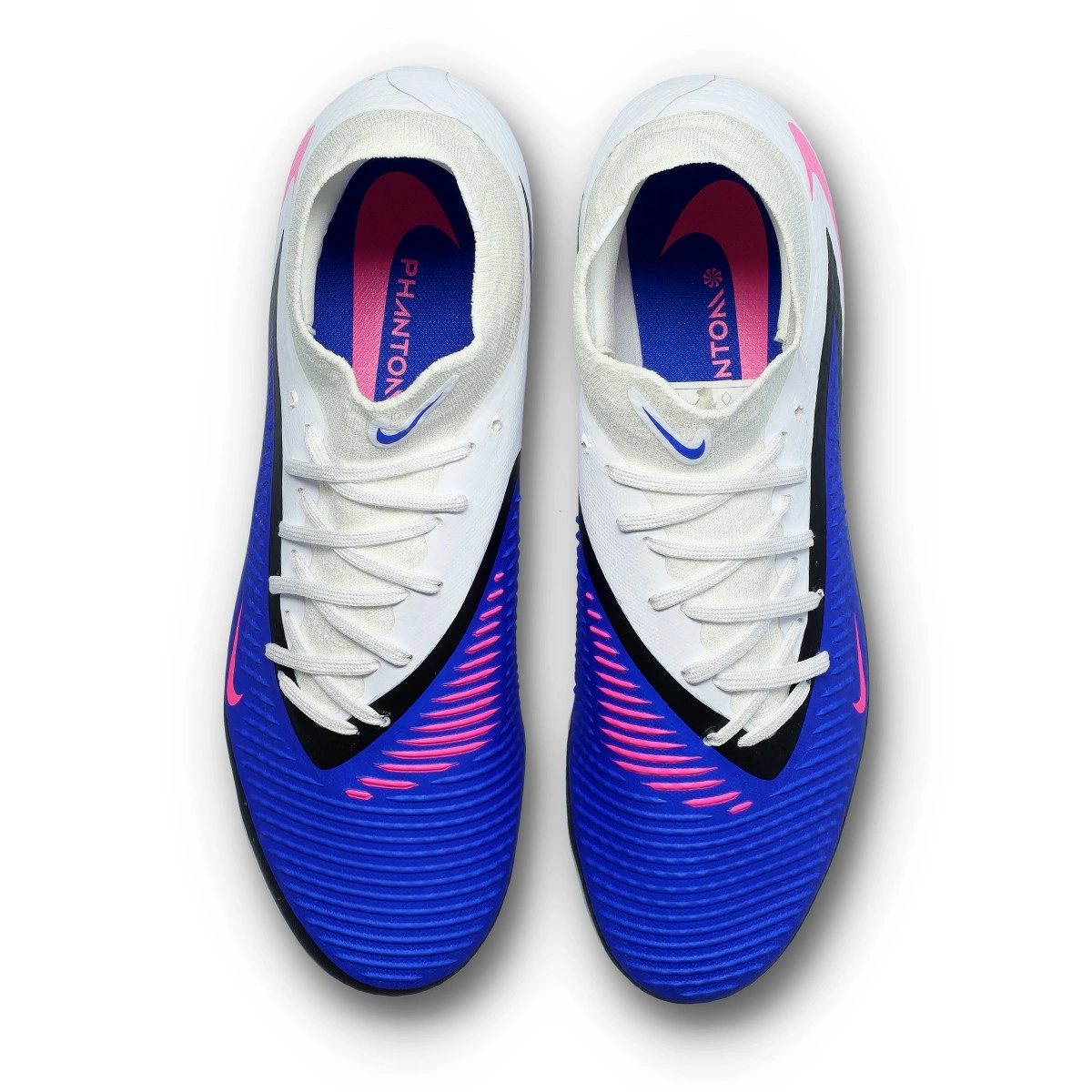 Scarpe da calcio Nike Phantom 6 High Academy FG/MG. In filato, con calzino, da usare su campi in erba naturale asciutto o sintetica di prima generazione. Di gamma alta, per giocatori che puntano su controllo e precisione, disponibili nella colorazione Racer Blue-Pink Blast-White.