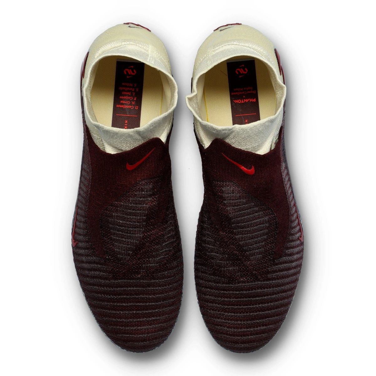 Scarpe da calcio per adulti Nike Phantom 6 High Elite FG. D'alta gamma, con calzino, per giocatori che puntano su controllo e precisione, disponibili nella colorazione Burgundy Crush-Mtlc Silver-Univ Red-Fossil. Da usare su campi in erba naturale.