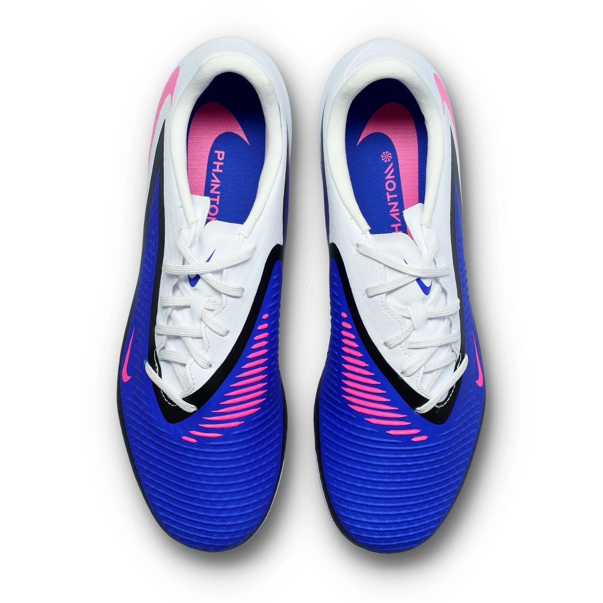 Scarpe da calcio Nike Phantom 6 Low Academy AG. In filato, senza calzino, da usare su campi in erba sintetica. Di gamma media per giocatori che puntano su controllo e precisione, disponibili nella colorazione Racer Blue-Pink Blast-White.