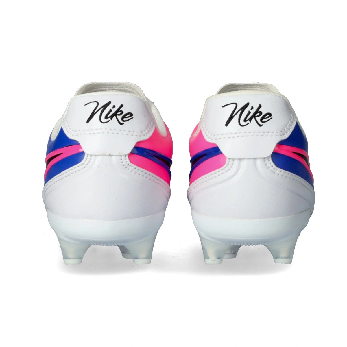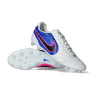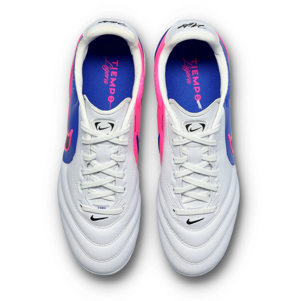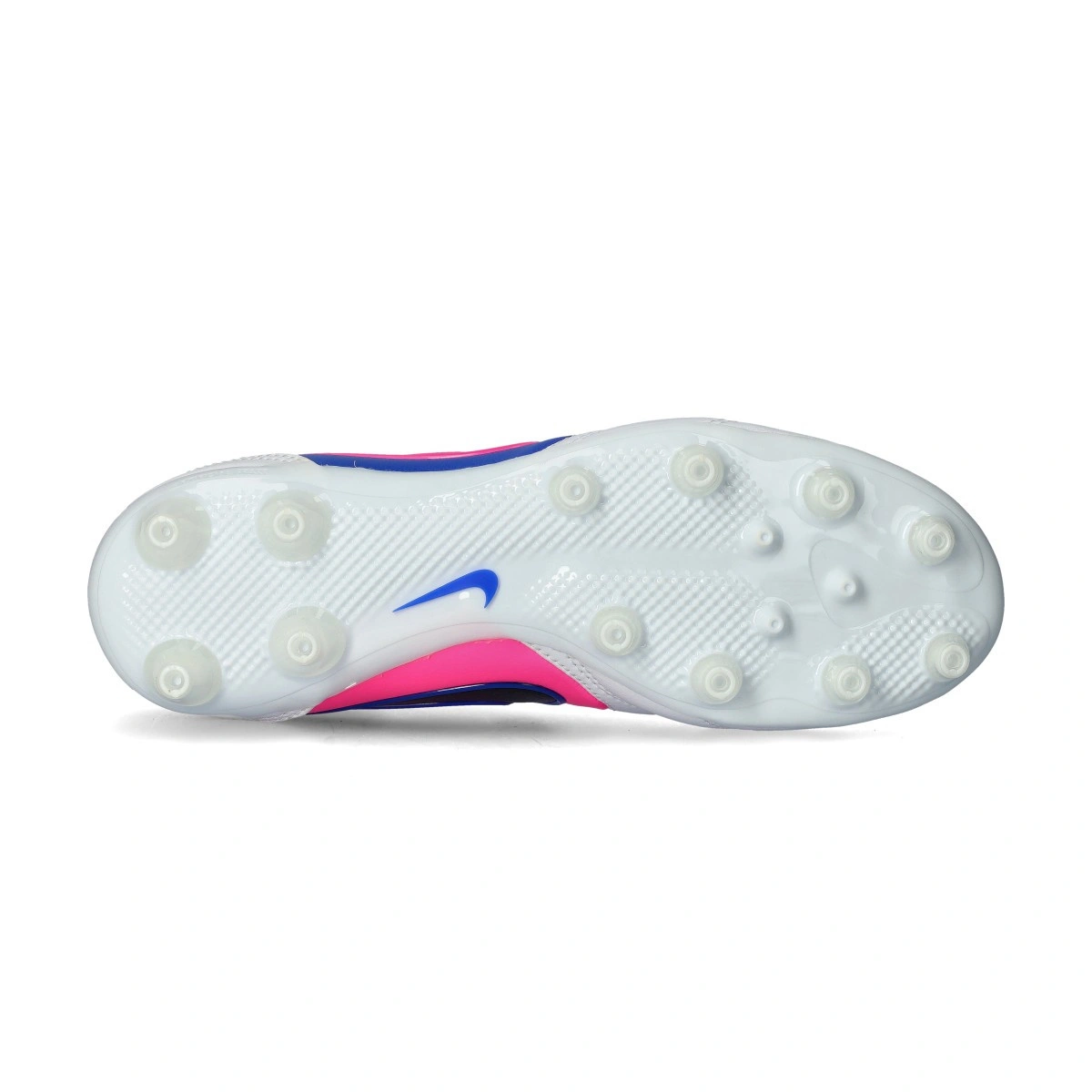 Scarpe da calcio per adulti Nike Tiempo Ligera Pro AG. Da usare su campi in erba sintetica. Di gamma media e disponibili nella colorazione White-Black-Racer Blue-Pink Blast.