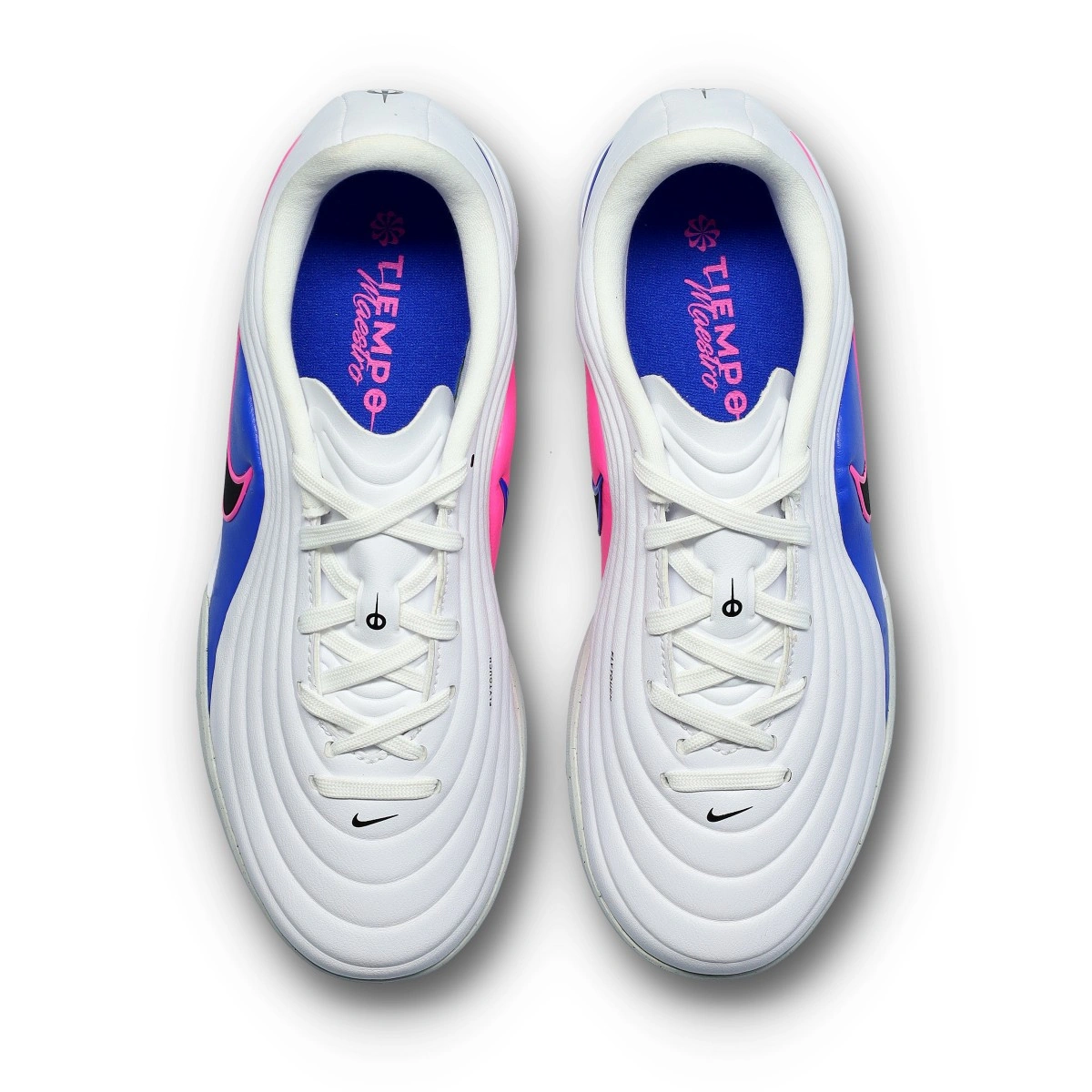 Scarpe da calcio per bambini Nike Tiempo Maestro Academy Turf. Da usare su moquette o campi in erba sintetica. Di gamma base e disponibili nella colorazione White-Black-Racer Blue-Pink Blast.