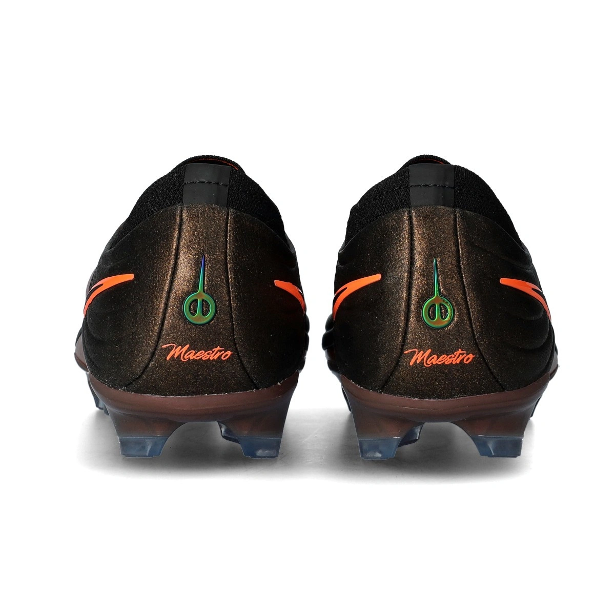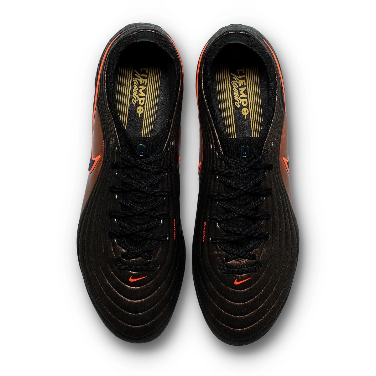Scarpe da calcio per adulti Nike Tiempo Maestro Elite FG. In pelle Flytouch plus da usare su campi in erba naturale. D'alta gamma e disponibili nella colorazione Black-Laser Orange-Hyper Crimson.
