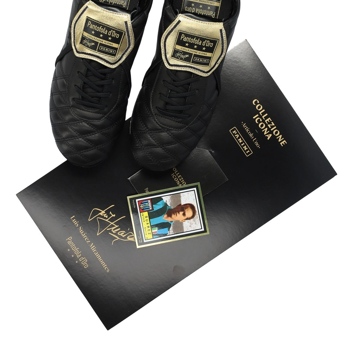 Rendi omaggio a un'icona con le scarpe da calcio Pantofola d'Oro Emidio Icona SL x Luisito FG. Un'edizione speciale delle Emidio SL che rende omaggio a uno dei migliori centrocampisti della storia, “L'Architetto”, Luis Suárez Miramontes. Fa parte della “Collezione Icona” di PdO e Panini ed è presentata in una confezione speciale con una riedizione della figurina Panini originale di Suárez.